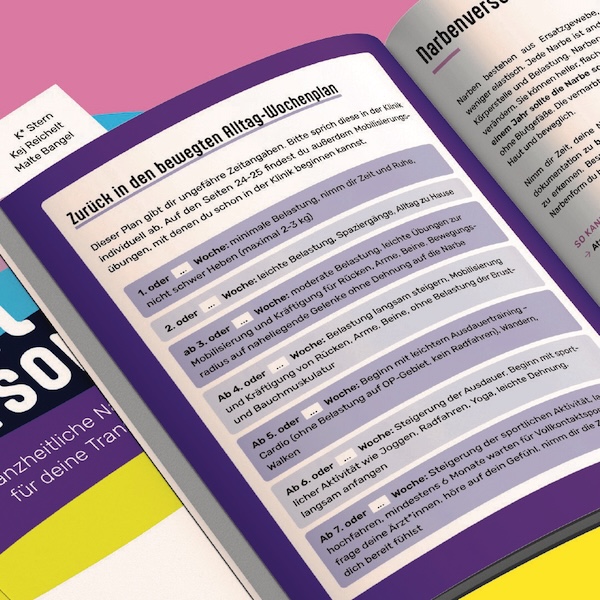 Zur Unterstützung für trans*/nichtbinäre Leute, die sich auf eine OP vorbereiten oder sich in der Nachsorge befinden. Auch für begleitende Fachkräfte gut nutzbar.