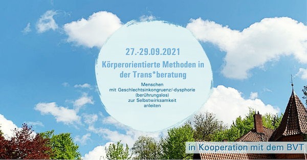 Sie arbeiten oder engagieren sich in der Beratung von trans* Personen und ihren Angehörigen? Sie begleiten trans* Personen psychotherapeutisch? Sie suchen kollegialen Austausch und/oder einen geeigneten Rahmen für Supervision? Sie möchten erfahren, mithilfe welcher berührungslosen körperorientierten Interventionen Sie Personen mit Geschlechtsinkongruenz/-dysphorie (GI/GD) unterstützen können?