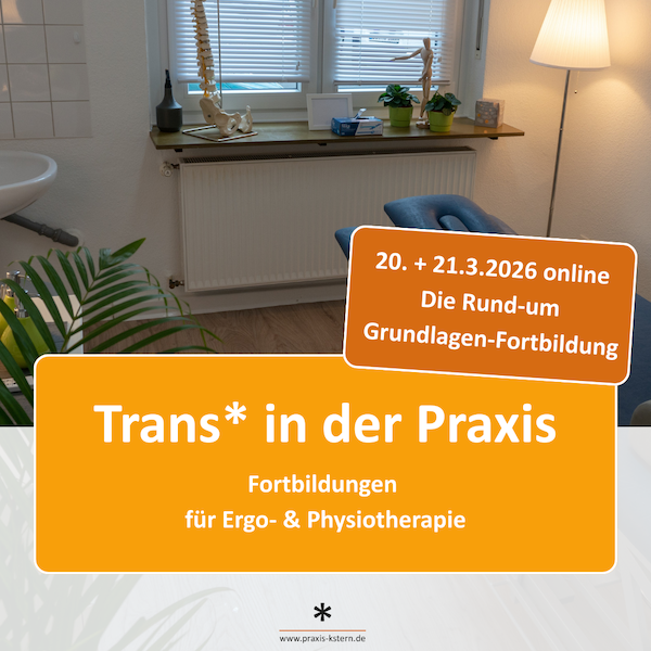 Grundlagen-Fortbildung für mehr Sicherheit in der ergo- und physiotherapeutischen Behandlung von trans* und nichtbinären Menschen. Bequem online bei dir vor Ort, in kleiner Gruppe, ohne zusätzliche Reisekosten 🙂